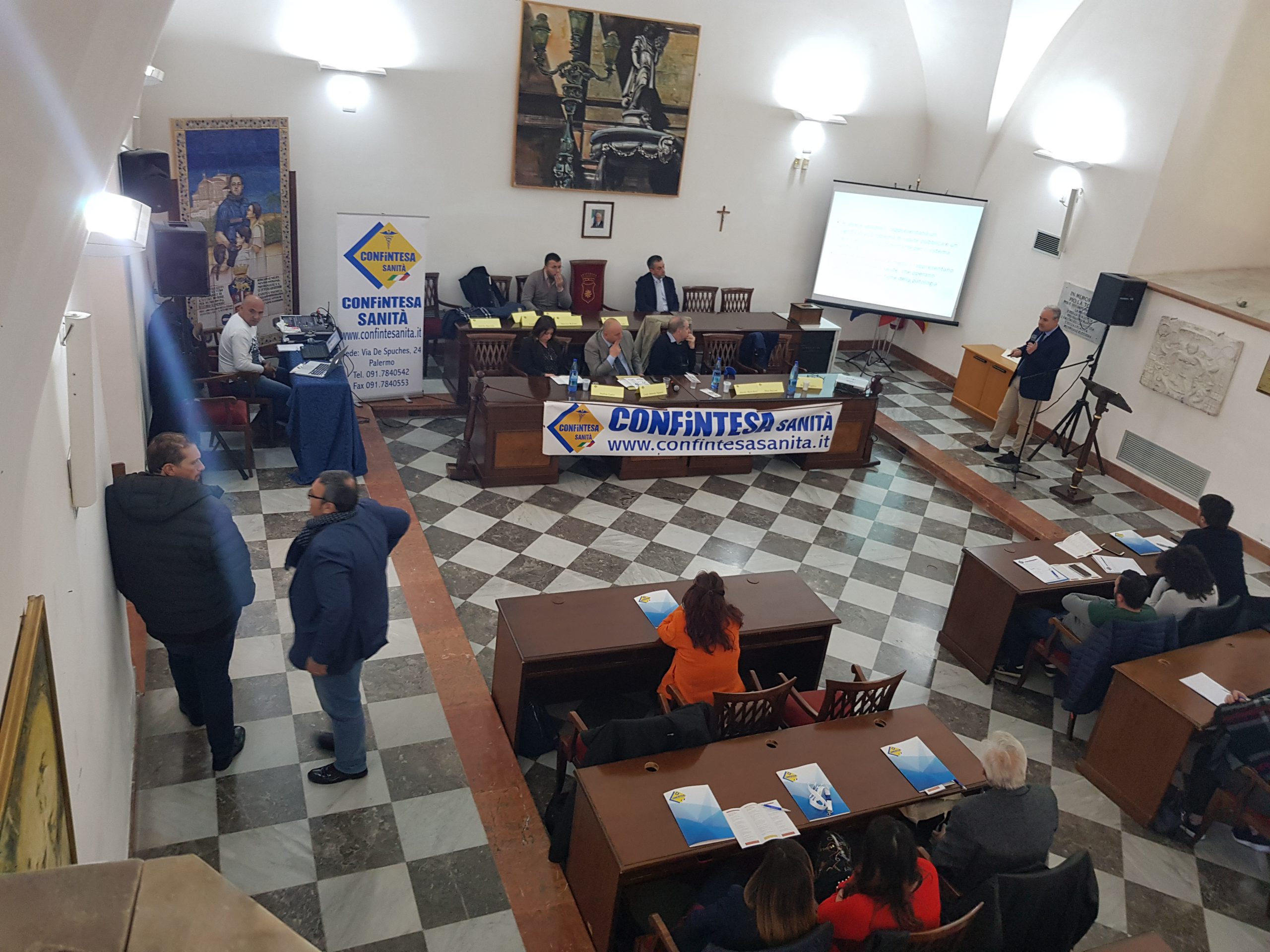 Il primo corso ECM organizzato da Confintesa Sanità, oggi 22.11.2019, prende vita presso la prestigiosa location dell’aula Consiliare del Comune di Monreale in provincia di Palermo. Presente il Segretario Nazionale Confintesa Sanità, Dr. Domenico Amato per portare i saluti della Federazione Sanità, il Dr. Andrea Lepre, Dirigente Sindacale Confintesa, Moderatore e Coordinatore del corso, il Dr. Maurizio Bellomo, Segretario Aziendale Confintesa ISMETT e Relatore del Corso, il Dr. Luigi Modesto Dirigente sindacale Confintesa e Relatore del Corso , il Dr. Gianfranco Episcopo e Relatore del Corso, il Dr. Aurelio Speciale Dirigente Sindacale Confintesa e Relatore del Corso. Esterni a Confintesa sono presenti: Il Dott. Luigi Antonio Signore, Dirigente Medico ASP 6 Palermo, Prof. Silvio Buscemi, Dietistica Università degli studi di Palermo, Dr. Roberto Vaglica, Dr. Rosario Cucciarè Coordinatore dell’assistenza Domiciliare Integrata azienda Sisifo, Dott. Sciacca Sergio, Cardio Chirurgo ISMETT, Dott. Giuseppe Valenti, Ortopedico Ospedale Buccheri la Ferla, Dr. Giuseppe Menzo, Infermiere Professionale Ospedale Buccheri la Ferla, Dr. Giancarlo Cappello, Formatore, Dr.ssa Silvana Zagarrí, Infermiera Professionale. Il corso si svolgerà in due date, oggi e domani 23 novembre 2019.“Sono fiero del lavoro svolto dai miei dirigenti sindacali volto alla creazione ed alla organizzazione di questo primo corso ECM di Confintesa, sono sicuro che questo sarà solamente il primo di una lunga serie di corsi organizzato dalla nostra organizzazione sindacale, già questo corso ha avuto un buon numero di adesioni, più di cento partecipanti; fare sindacato vuole dire dare anche servizi ai propri iscritti, oggi Confintesa Sanità lo ha fatto, dandogli la possibilità di usufruire gratuitamente di un ottimo corso; ringrazio il Sindaco di Monreale, Alberto Arcidiacono ed il consigliere comunale Francesco La Barbera per la loro disponibilità nell’averci concesso l’Aula Consiliare del Comune”, così dichiara Domenico Amato, Segretario Nazionale Confintesa Sanità.